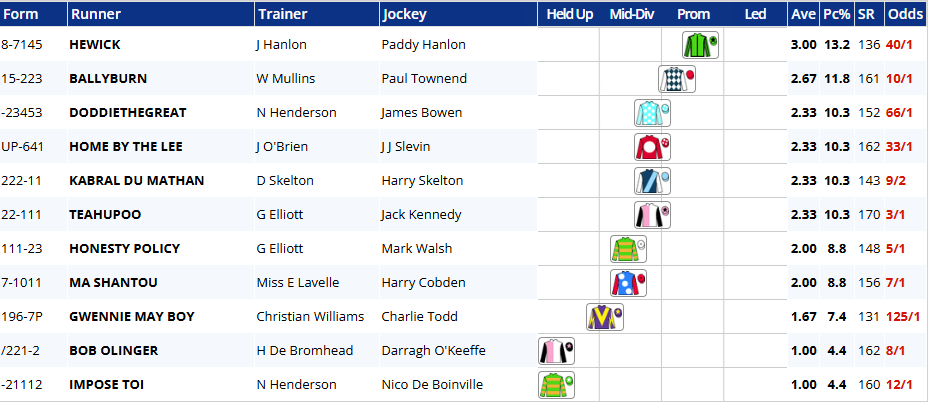 For my run style the stats, I am again focusing on the last 10 renewals. These races have seen a huge number of runners racing mid division or held up near or at the back. A total of 78% of all runners have had either of those two run styles. Eight of the ten winners (80%) have won from a mid-div or held up sit, so essentially for winners, there has been little in it run style wise. However, it should be noted that, although front runners have won just once, seven have been placed (PRB 0.67).