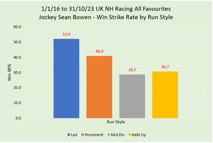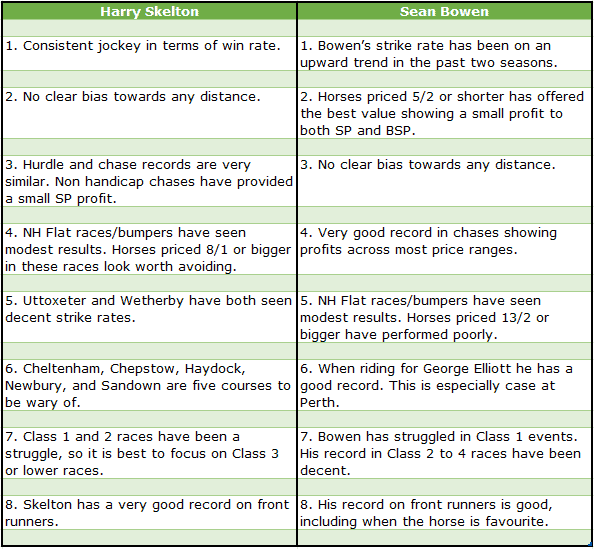 For this article, I have been looking at the performance of horses that were ridden last time out by some of the top jockeys in the country. I have chosen the following – Nico de Boinville, Sean Bowen, Harry Cobden, Brian Hughes, Gavin Sheehan and Harry Skelton. These six have had some of the best win percentages of recent years as well as riding a decent number of horses each season, which means we have an excellent initial sample size from which to work.