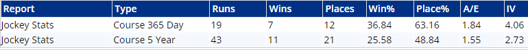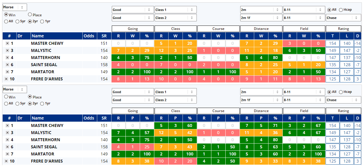 Saint Segal would be an unlikely winner after eight losses on the bounce, but always tends to be there or thereabouts (50% place strike rate from 16 starts!) and was third in this race last year off 2lbs higher than today. Martator has yet to finish out of the first three in eight efforts over fences and comes here off the back of three straight wins, including one over course and distance, whilst bottom weight Frere D'Armes looks like getting back to his old form after making the frame in his last two outings, going down by just a length at Kempton a fortnight ago. This is tougher from out of the handicap though and here's how all six have fared under these conditions over the last couple of years from both a win and a place perspective...