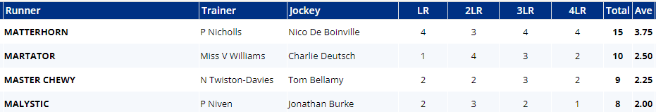 Master Chewy has made the frame in 5 of 7 over fences and was a runner-up beaten by just a head at grade 1 last time out, Malystic is 10 yrs old but hasn't given up just yet, placing in each of his last three and also went down by a head as runner-up last time out, but he is up in class here, as is Matterhorn whose run of four successive chase wins from his first four attempts was ended when pulled up at Newton Abbot in August.