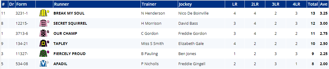 Now, I really like Afadil as a horse, but if I'm following the process, he's the weakest on both IE and pace and as much as I think Fiercely Proud has a great chance here, he doesn't score as well as the others on both counts either. I also have some reservations about his temperament, he had to be withdrawn at Cheltenham last week after unseating his jockey and getting loose. If he behaves himself and gets away with the others, he could well win, but I'm not convinced he won't play up, so I'll reluctantly omit him and take the other four; (1) Our Champ, (8) Secret Squirrel, (9) Tapley and (11) Break My Soul