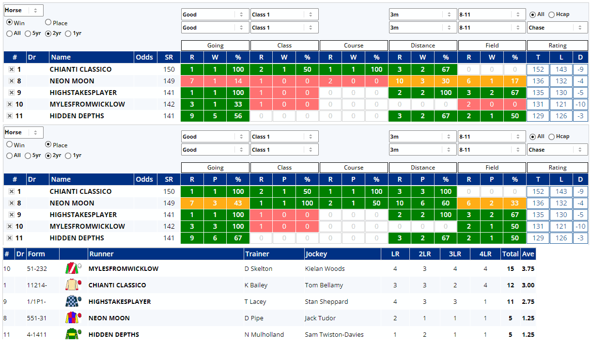 (1) Chianti Classico was 1121 in 3m/3m1f chases last season culminating in a Class 1 handicap win at the Cheltenham Festival before tackling a Grade 1 at Aintree. That proved to be a bit strong for him, but he ran with credit, going down by 8 lengths. (8) Neon Moon ended last season by winning at Newbury and then finishing third of eight at Kempton before taking 159 days off. He then reappeared at Chepstow three weeks ago and despite running from 4lbs out of the handicap, managed to win by a length and a half.